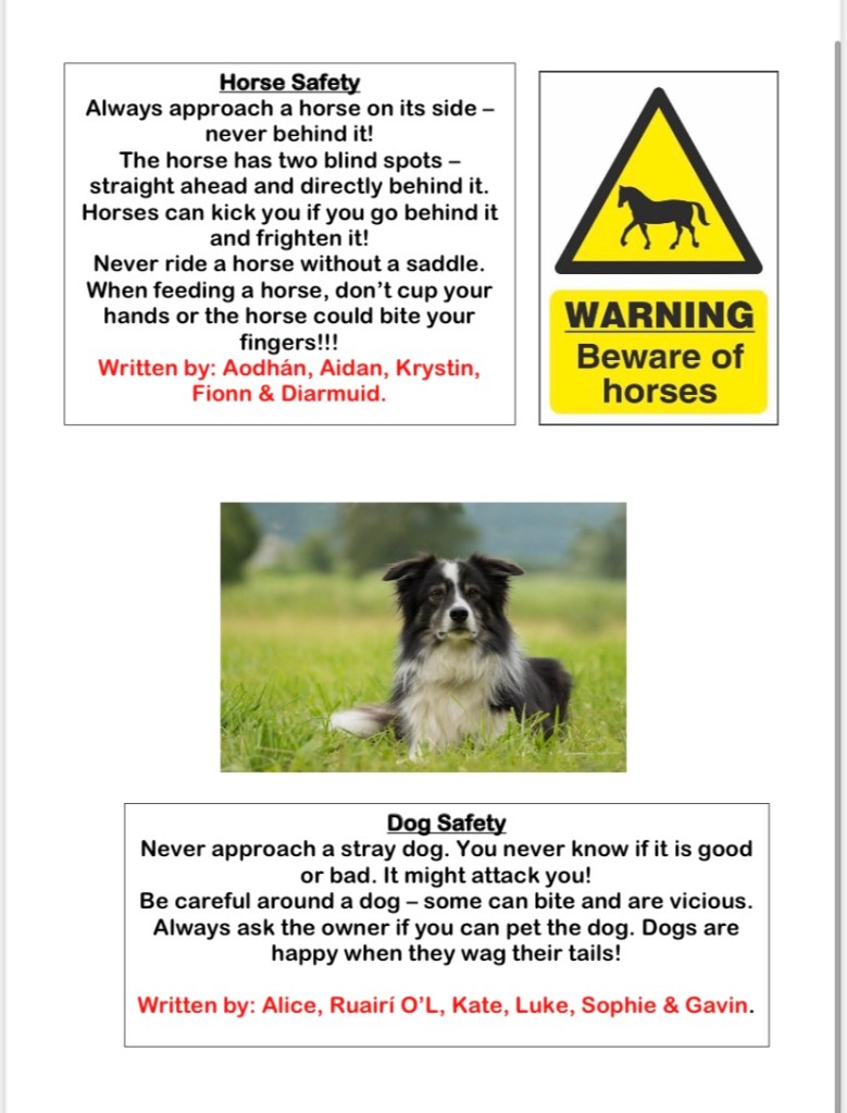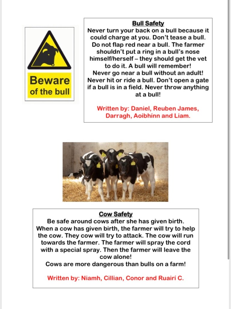 After a lot of class discussion the children worked in groups and wrote a fact file about the different animal and being safe around bulls, cows, horses and dogs.